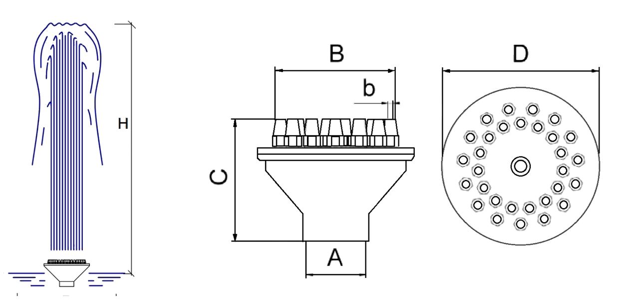 Распыляющая форсунка Foamy Column Jet формирует устремляющуюся вверх колонну воды. Пенный эффект достигается за счет смешивания большого количества отдельных струй с воздухом между ними. Эта модель идеально подходит для больших уличных фонтанов. Обратите внимание, выходное отверстие насадки должно размещаться выше уровня воды в водоеме.